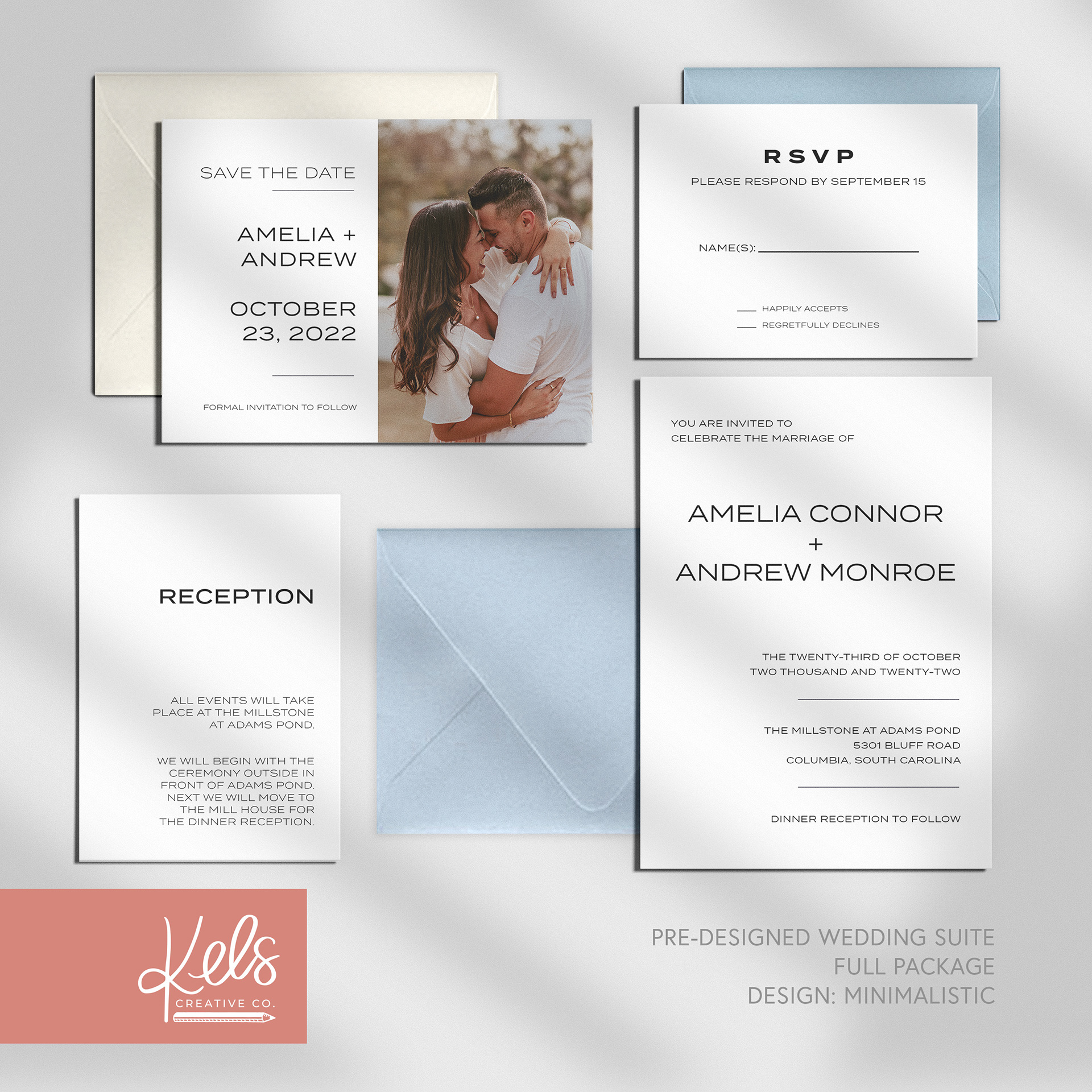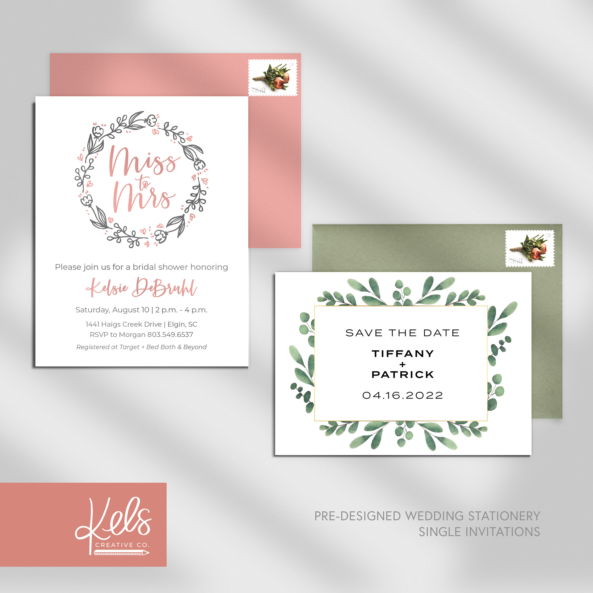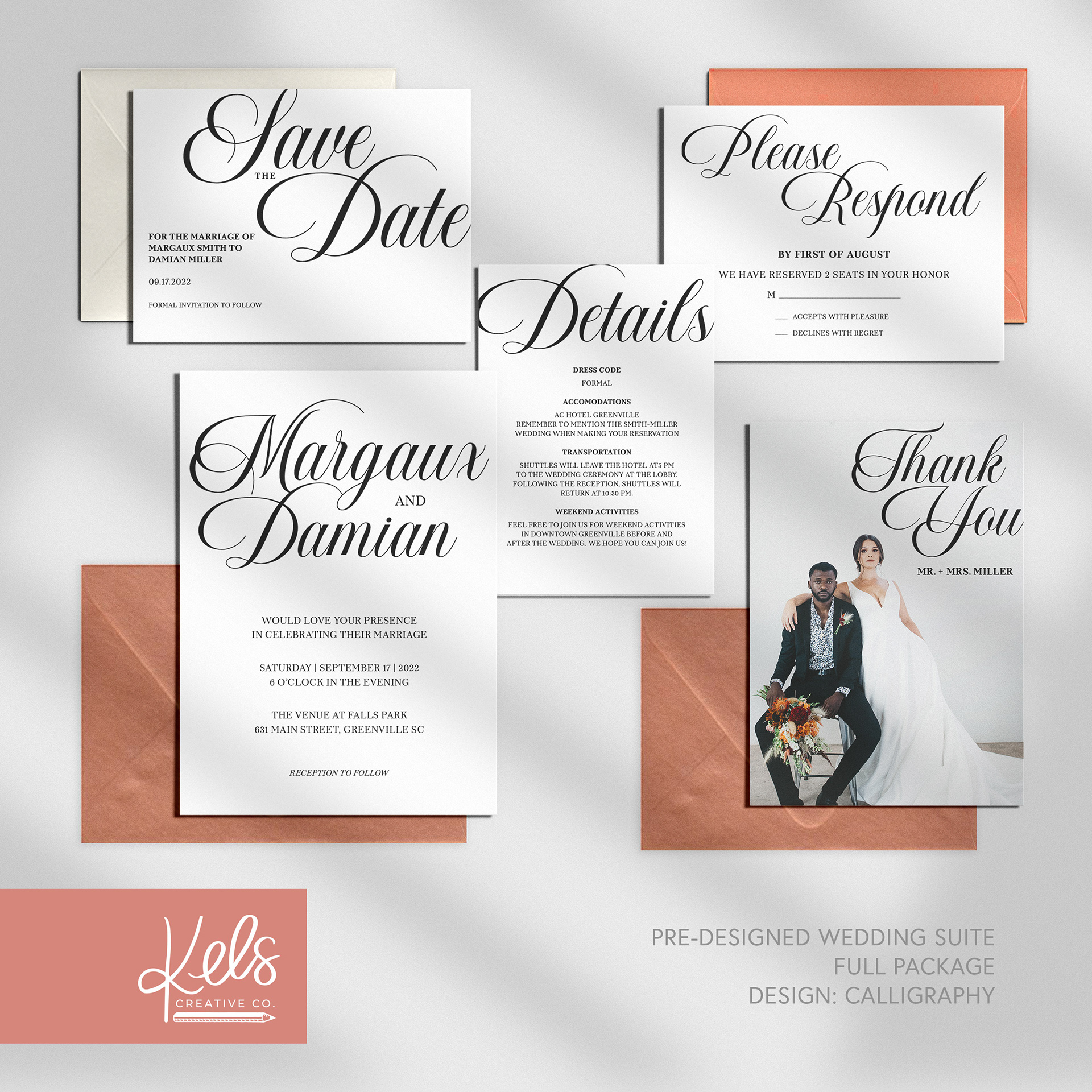 Various wedding suite designs created by Kels Creative Co. These pre-designed suites offer several different design styles for a budget-friendly option.